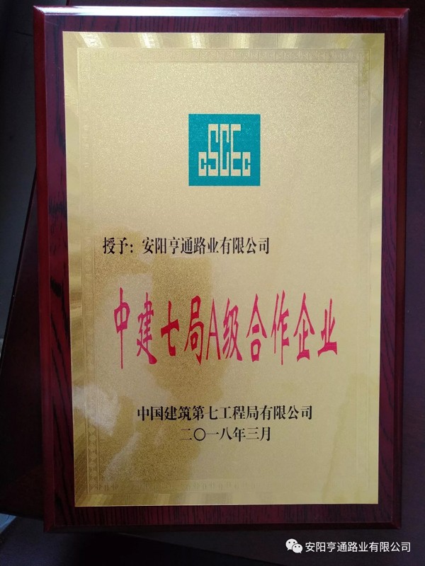 在2018年3月8日中建七局交通公司“2018年度生產(chǎn)推進(jìn)會(huì)暨2017年度供應(yīng)商大會(huì)”上,安陽亨通路業(yè)有限公司又獲得了中建七局交通公司頒發(fā)的“優(yōu) 秀合作企業(yè)”的榮譽(yù)稱號(hào)。